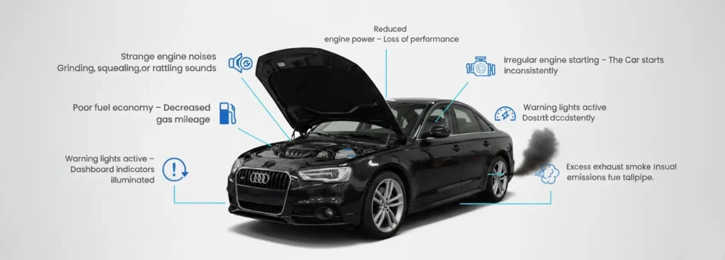 Common warning signs include flickering or dimming headlights, electrical glitches (such as slow windows), a battery warning light on your dashboard, or unusual grinding noises coming from the engine bay.